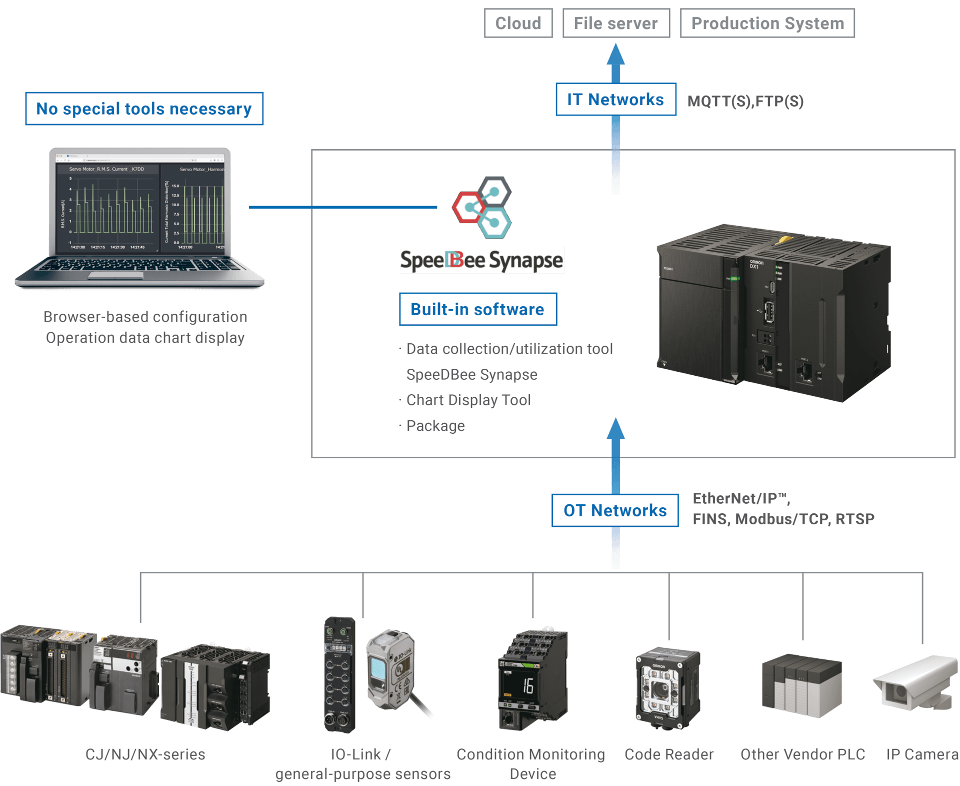 EtherNet/IP, Ethernet TCP/IP, MODBUS/TCP, Other, USB | Data Flow Controller DX1 CPU with SpeeDBee Synapse, Chart Display Tool, built-in 2 Ethernet ports and 1 USB port |